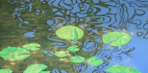 I painted what I had captured photographically in quiet time beside the still waters of the lilypond, focusing on the lines of the heavenly-blue reflections and my creative vision of the movement of gold dust across the vista, as signifier of the Presence that I sensed hovering over the waters, as just as He did in Genesis.
