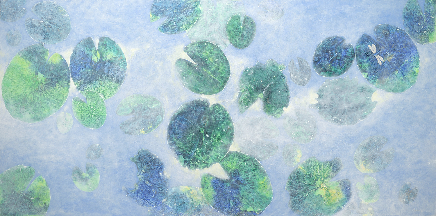 The lilypond, viewed from above, reflects heaven. I began with bright blues and greens. But as I looked at it, it beckoned me for more. So I created misty layers of depth, and a sense of movement across the canvas, with accents of warm light to highlight the complex and varied edges of waterlilies. This adds a sense of experiencing the realm of Spirit and Light… beside the still waters of the lilypond.