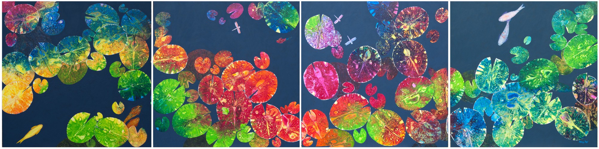 Lily pads form a curved ‘bridge’ that reaches across the panels, on which a green frog rests, and under which fish seek shelter and play. Dragonflies hover overhead, and rainbows of colour convey joy and hope and bright futures for the children at Nambour Primary School.