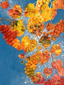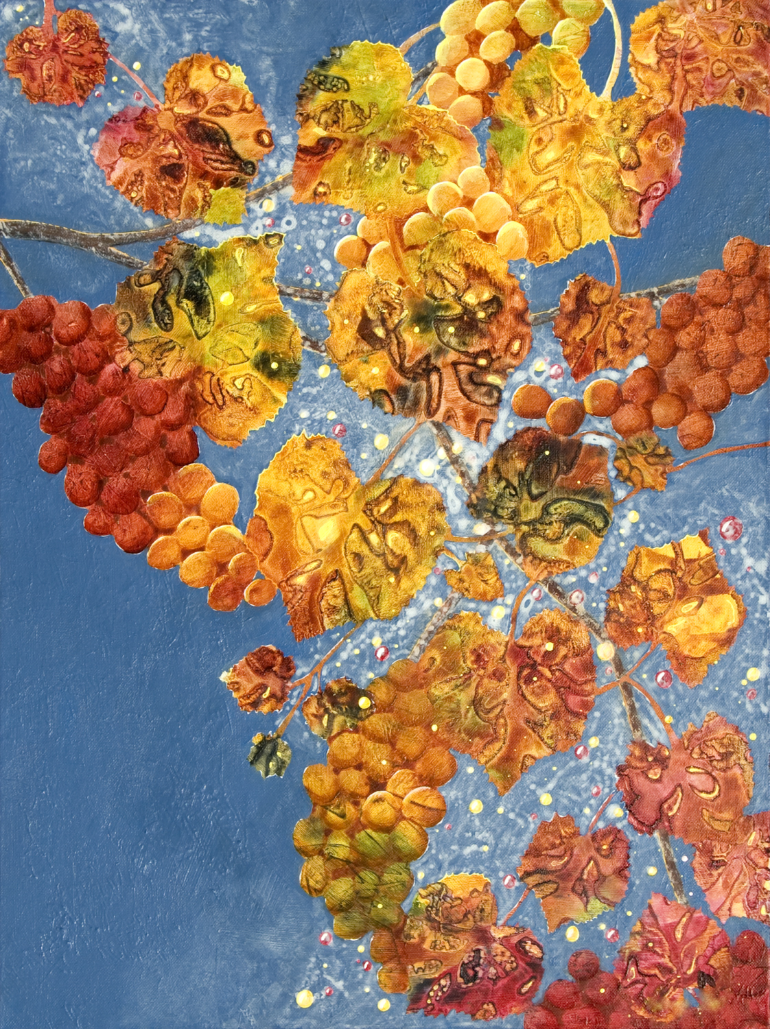 Vine leaves and fruit glow in warm autumn colours against the clear blue sky. Lost and found edges weave between spatter and bubbles of wine… There are jewel-like reflections on leaves, and the fruit is filled with rainbows… Hearts become leaves and leaves become hearts…