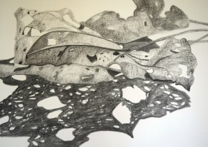 The white-on-white still life really engaged my creativity and demanded that my powers of observation increase. The project increased my capacity to see tonal shifts within both surfaces and shadows; the various edges that ranged between crisp, hard-edged leaf edges, all the way through to multiple layers of shadows with soft edges; and then translate these into charcoal on paper – on an A1 scale. I learned to become inventive and adapt my application of charcoal and chalk to the surface, tone and/or edges I was attempting to render – and even capture an interpretation of the leaf corpuscles, bumps and fractals that feature on leaves if one takes time to look closely.