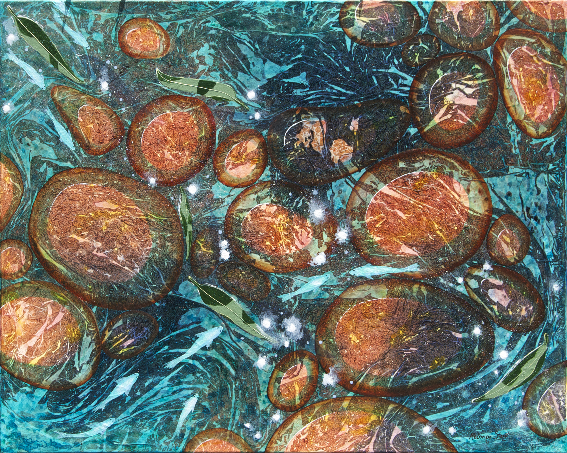 Refreshing, life-giving water… A scattering of gum leaves establish the sense of place among the Australian pebbles. Depth and life and reflections of heaven are everywhere, if you look with open eyes.