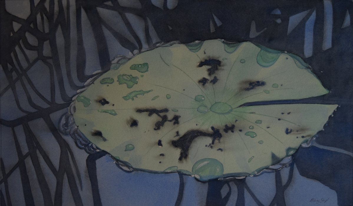 This image is a watercolour visual equivalent of the word “silence” – alone, reflective, horizontal equilibrium, absolute stillness so not even the water droplets quiver. It’s the ultimate contemplation space…